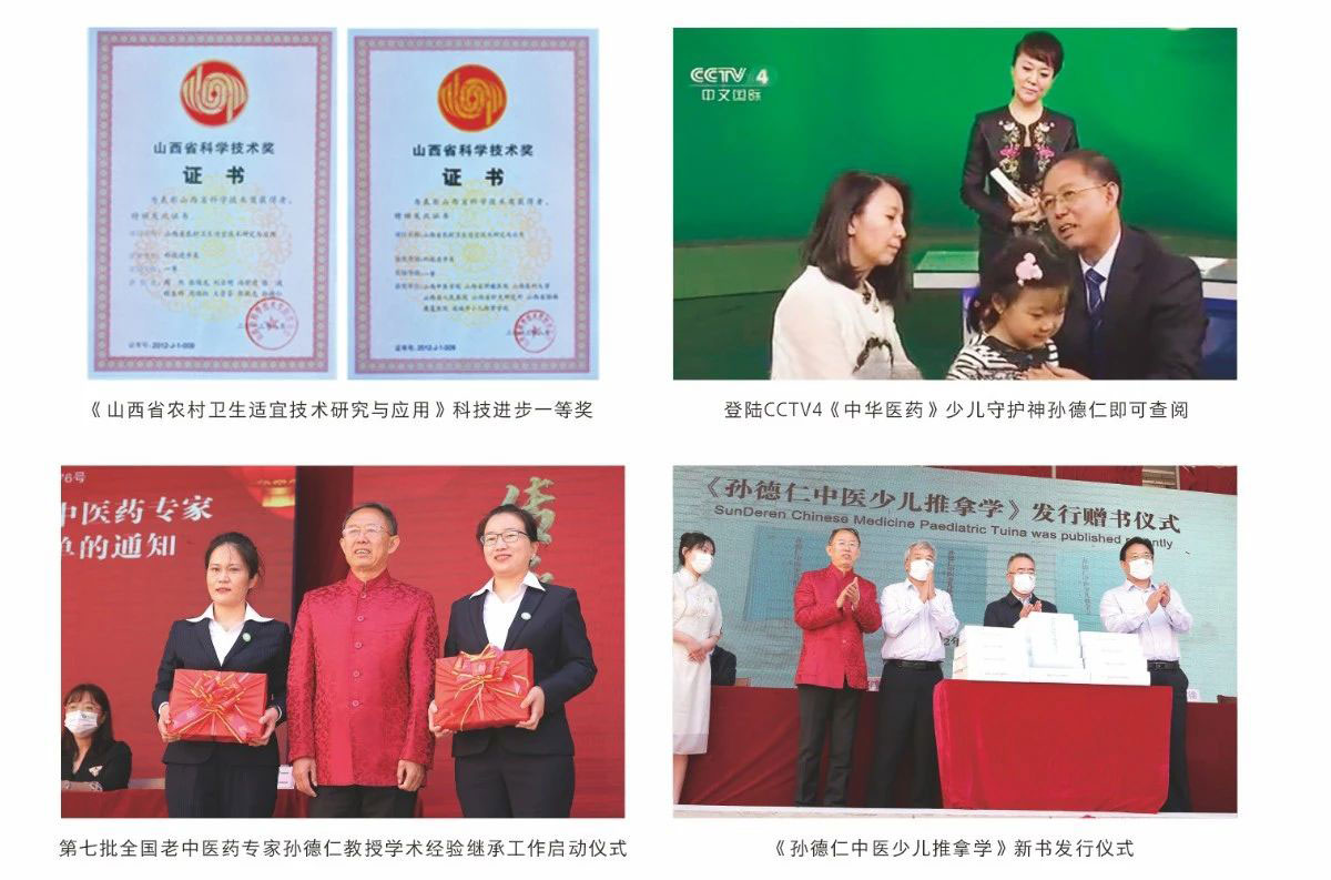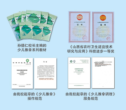 我校坚持教学、临床、科研三结合办学模式,设有附属德泽少儿推拿医院,坚持教学探究,注重临床实践。首创少儿亚健康推拿调理分支学科,奠定了我校在少儿推拿学科领域的主导地位。承担了国家中医药管理局《中医养生保健技术操作规范·少儿推拿》的起草工作;获得了《山西省农村卫生适宜技术研究与应用》科技进步一等奖。中国中医药出版社先后出版发行了孙德仁教授主编的+三本系列教材,最近出版《孙德仁中医少儿推拿学》,其学术思想编入全国高等中医药十三五、十四五规划教材。学校以三十年之功,建设成为全国中医少儿推拿学术重镇。