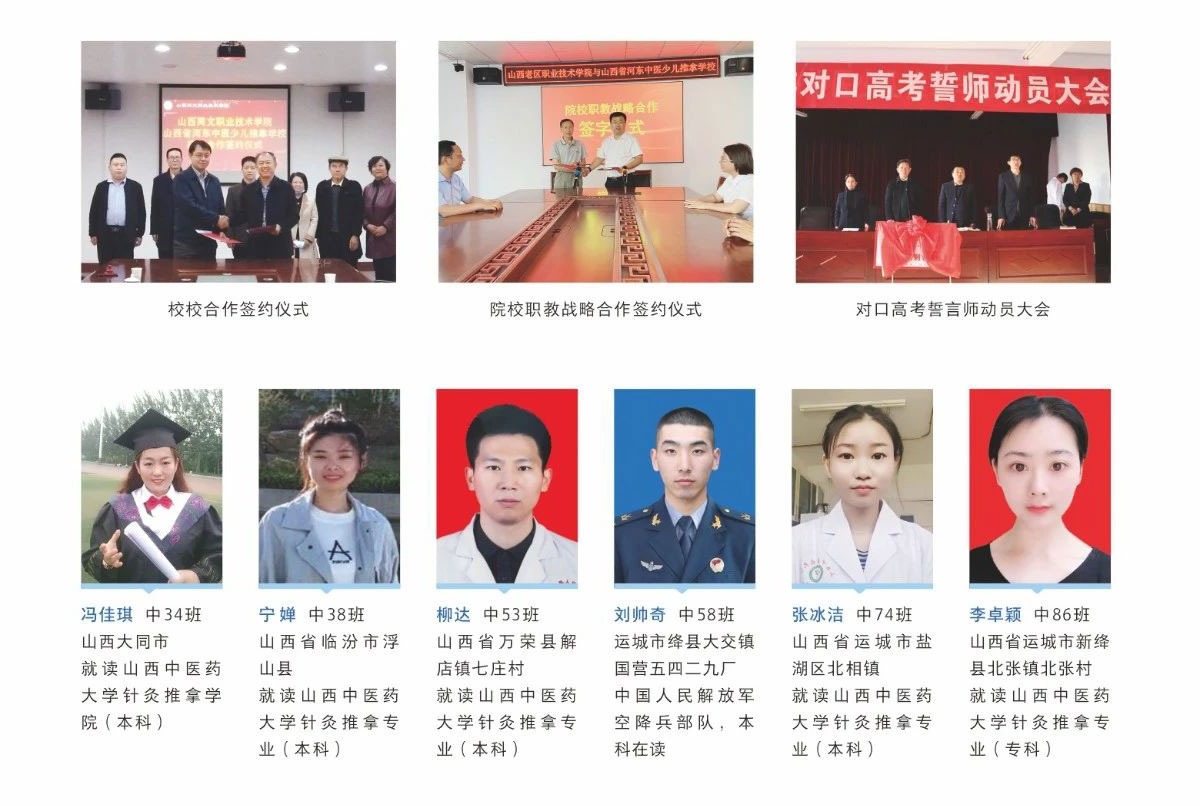 ★医学相类、护理类对口高考:通过对口高考班学习进入理想的医学类高等院校。对口高考院校有:山西卫生健康职业学院、运城护理职业学院、忻州、临汾、阳泉职业技术学院、运城职业技术大学、山西药科职业学院、太原老区职业技术学院等。