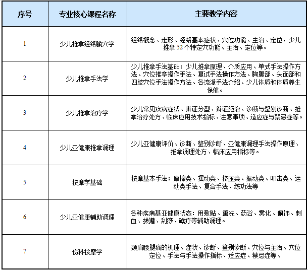 少儿推拿经络腧穴学、少儿推拿手法学、按摩学基础、少儿推拿治疗学、少儿亚健康调理、伤科按摩学、少儿亚健康辅助调理